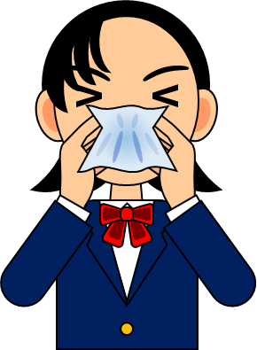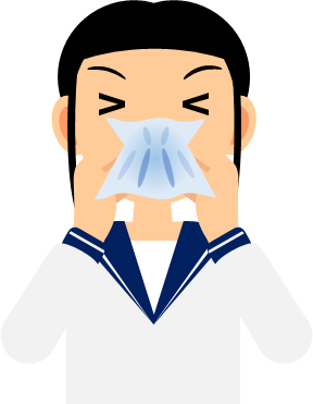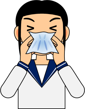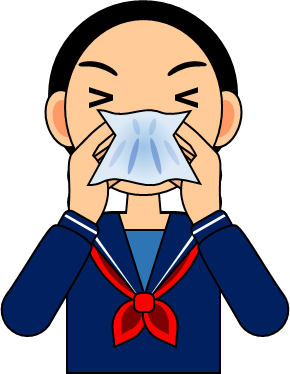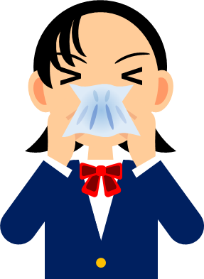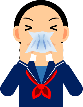 鼻をかむ子供、小学生、若い女性、女の子のイラスト、風邪、鼻づまり、花粉症、フチ有りフチ無しなど6種類