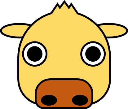 こっちを見ているウシの顔のイラストです。視線がこちらに向いていることで親しみや存在感が強く、シンプルに顔だけを描いた構図になっています。角や耳、鼻、目の表情を抑えたミニマルなタッチで仕上げることで、アイコンやロゴ、ワンポイントの挿絵としても使いやすいデザインです。色味や模様は和牛や乳牛などの品種に合わせて調整可能で、モノクロでもカラーでも用途に応じて馴染みます。