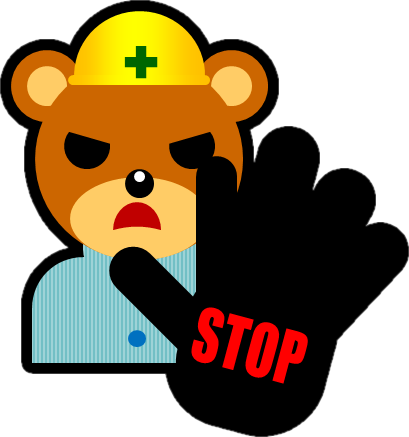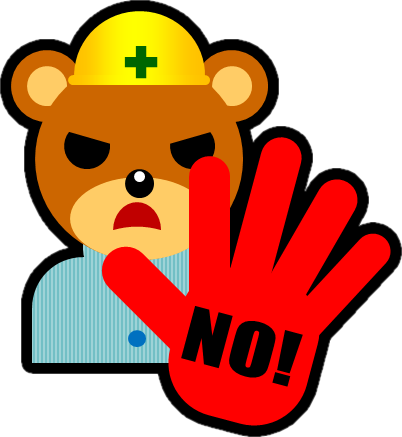 クマの作業員のイラスト、ヘルメットをかぶるクマ、お静かに、笑う、バツマーク、ストップ、マル、敬礼、頭を下げる、万歳、手を振る、カラーバリエーション、フチ有りフチ無しなど30種類